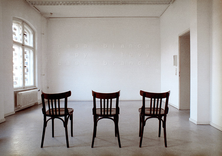 Wand-Text: CASA BLA NCA TAPY TUVY CASA BRANCA, Kasten mit Faltblatt, das über die unterschiedlich Bedeutung der Worte „weißes Haus“ Auskunft gibt.