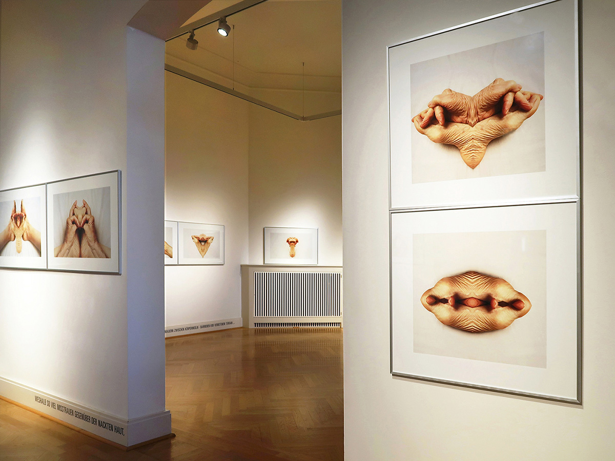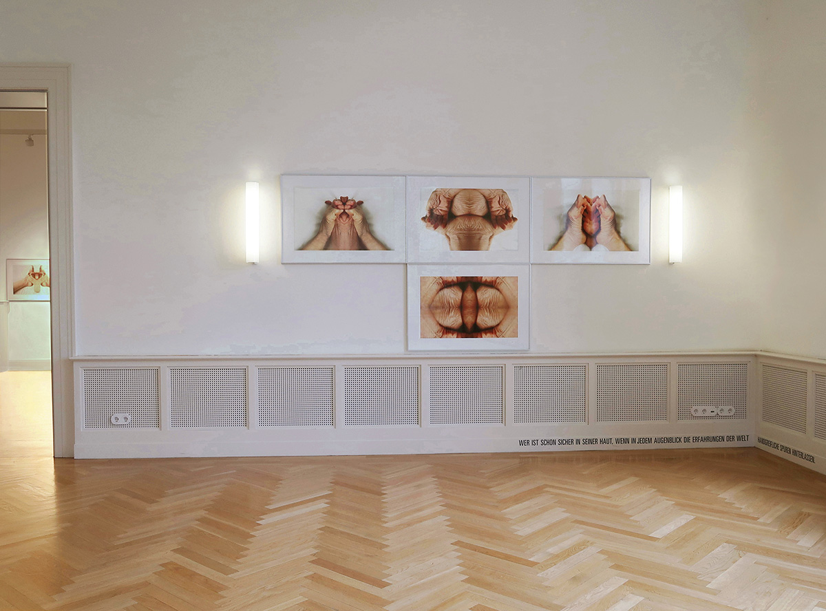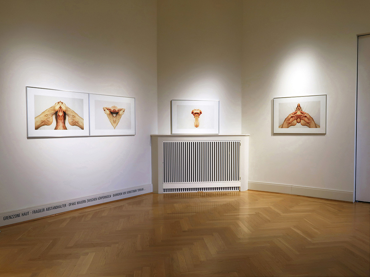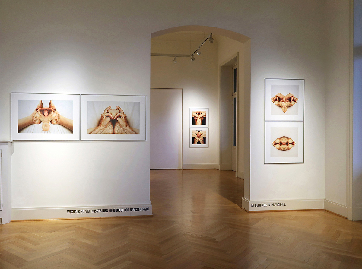 Die Fotografien werden in jedem der Ausstellungs-Räume von Texten zum Thema Haut/ Körper begleitet.